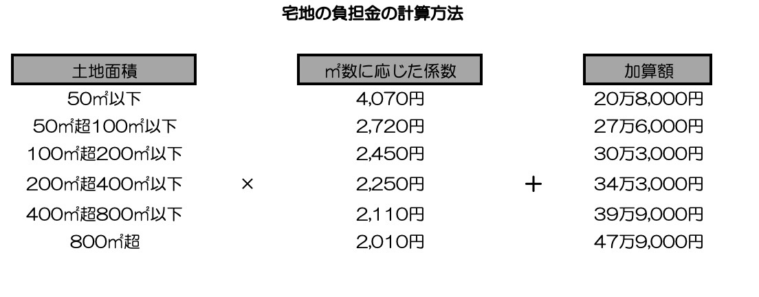 9月末の政令では負担金の計算方法も具体的になりました。宅地、農地、森林といった土地の種類や面積ごとに計算式があり、例えば都市計画法の市街化区域にある宅地で面積が「100㎡超200㎡以下」なら「面積×2450円+30万3000円」で算出します。市街化区域外にある宅地の負担金は原則として面積にかかわらず一律20万円となっています。※以下図、負担金の計算方法(1,000円未満の端数が出る場合は切り捨て計算)