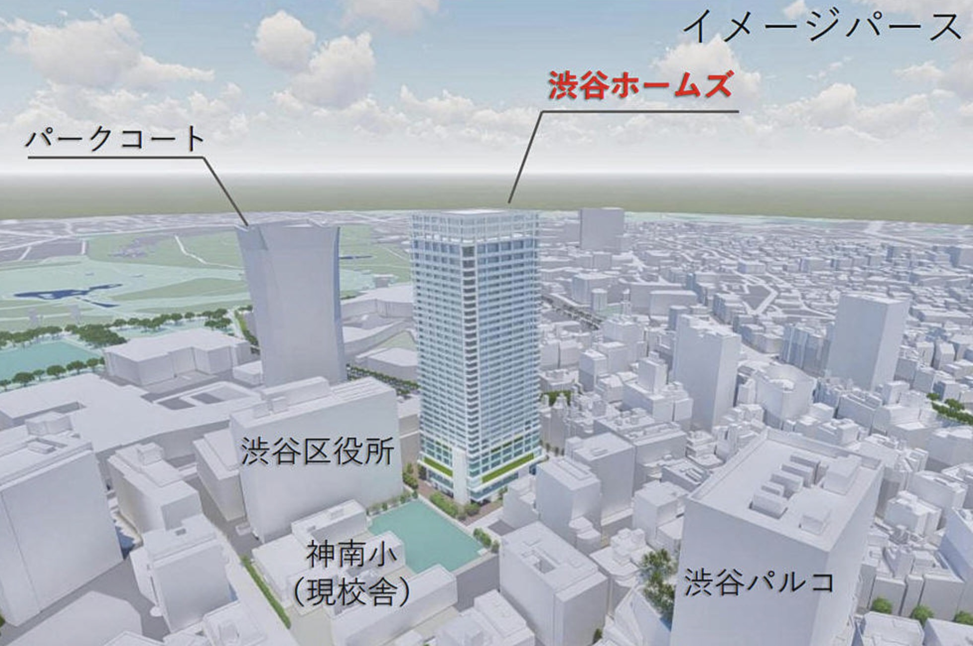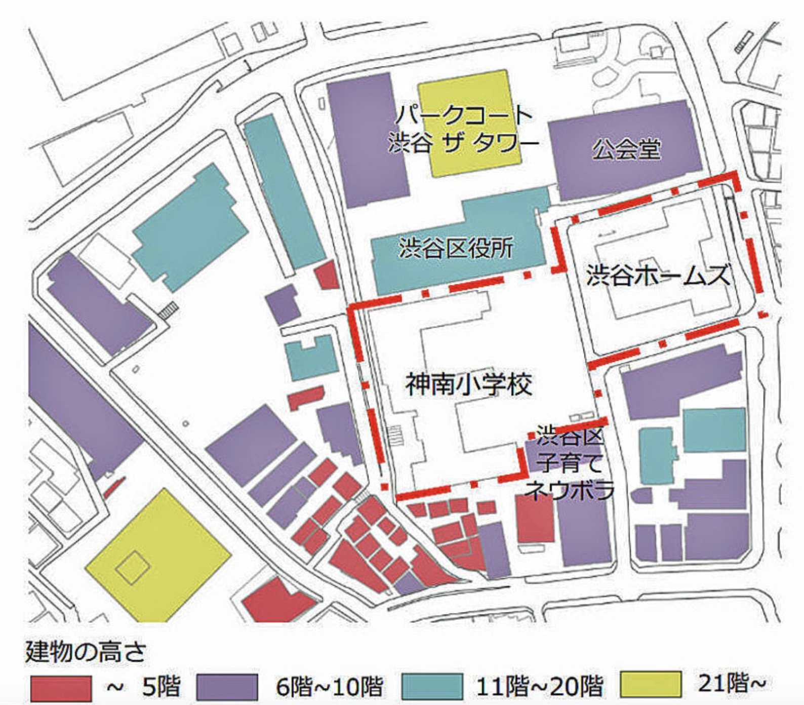 「官民一体開発」自体は珍しく有りませんが、今回の事業がなぜ注目されているかというと、当該地の「渋谷ホームズ(共同住宅)」の敷地は、老朽化で建替の方針もあった「区立神南小学校」と隣接しており、再開発事業では小学校用地と渋谷ホームズの敷地を同一街区として、一体的な再開発を進める計画だからです。ここで用いられるのが、「容積適正配分型地区計画」です。容積適正配分型地区計画は文字通り、地区内で容積を配分する仕組みで高容積を使うことが難しい土地がある場合に、余剰容積分を他の敷地に振り分け、その敷地で高容積の建物の建設を可能にするスキームです。2021年に再開発の準備組合から同制度の活用提案があり、区が検討を重ねてきた経緯があります。低容積部分の存在によって、環境の維持を図ることも目的とされ、民間施設の再開発で利用された例はあるものの、公共施設に活用されるのは、全国でも初の試みになるそうです。